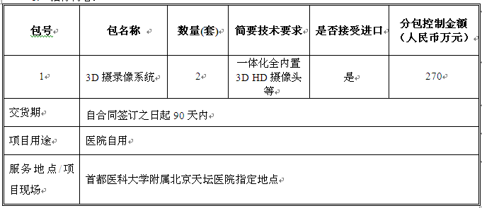 中技国际招标有限公司受首都医科大学附属北京天坛医院委托,就利用其财政性资金的“北京天坛医院3D摄录像系统采购项目”进行国内公开招标。现邀请合格供应商就下列货物和服务提交密封投标。
