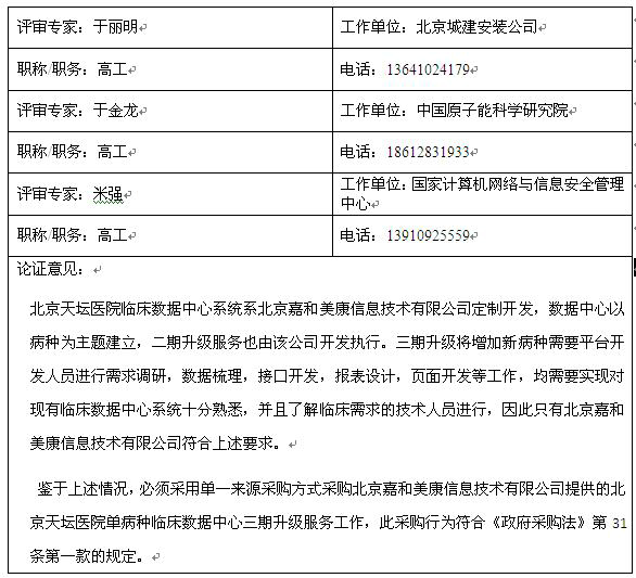 我院目前使用的临床数据中心系统系北京嘉和美康信息技术有限公司定制开发,二期升级服务也由该公司开发执行。三期升级将增加新病种需要平台开发人员进行需求调研,数据梳理,接口开发,报表设计,页面开发等工作,均需要实现对现有临床数据中心系统十分熟悉,并且了解临床需求的技术人员进行,因此只有临床数据中心原开发公司北京嘉和美康信息技术有限公司符合上述要求。