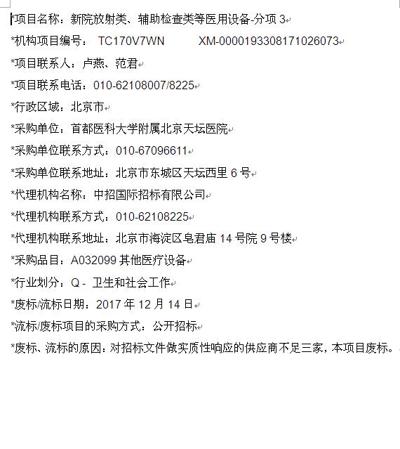 北京天坛医院新院放射类、辅助检查类等医用设备-分项3废标公告【机构项目编号: TC170V7WN XM-0000193308171026073】