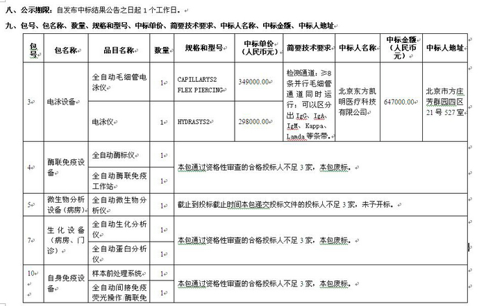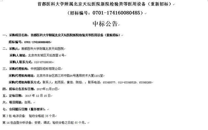 北京天坛医院新院检验类等医用设备(重新招标)中标公告(招标编号:0701-174160080485)