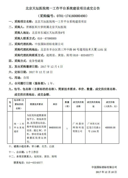 北京天坛医院统一工作平台系统建设项目成交公告(采购编号:0701-174160080490)