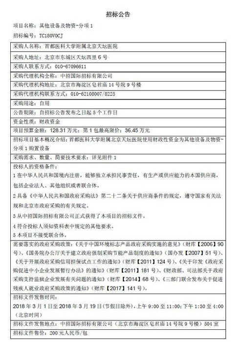 北京天坛医院其他设备及物资-分项1招标公告【编号:TC180V0CJ】