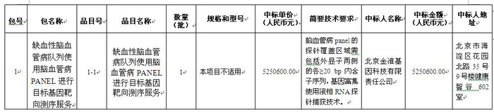 北京天坛医院缺血性脑血管病队列使用脑血管病PANEL进行目标基因靶向测序项目中标公告(招标编号:0701-184160100101)