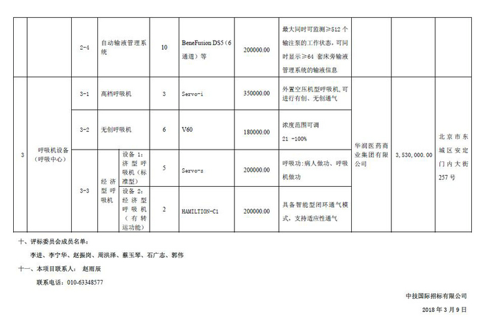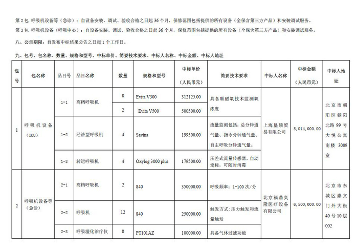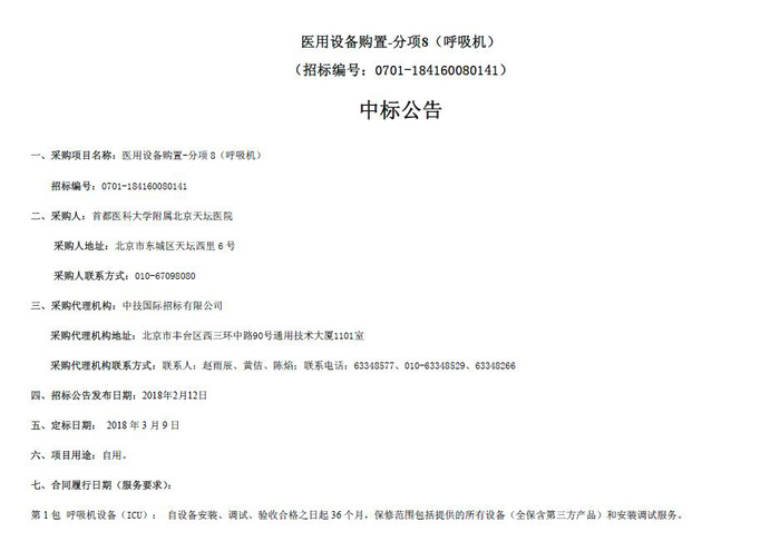 北京天坛医院医用设备购置-分项8(呼吸机)中标公告(招标编号:0701-184160080141)