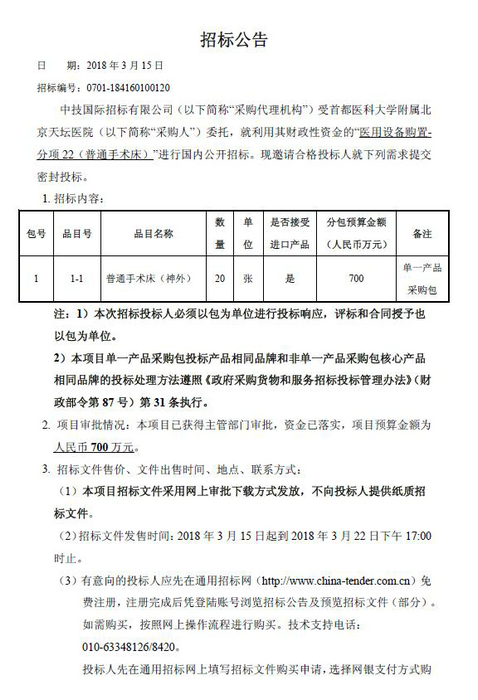 北京天坛医院医用设备购置- 分项22(普通手术床)招标公告