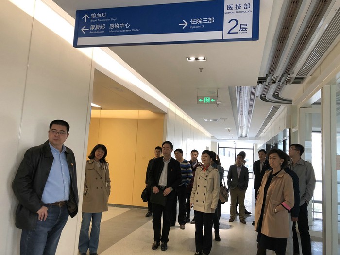 座谈会结束后,党委书记路明同志陪同国家卫生健康委员会医政医管局一行人员参观了天坛医院新院区。分别到病房楼、门诊楼、办公楼进行了现场察看,保卫处工作人员对新院工程亮点、科室布局、建设布局的先进性、人性化、节能化和建设进度进行了详细的介绍。