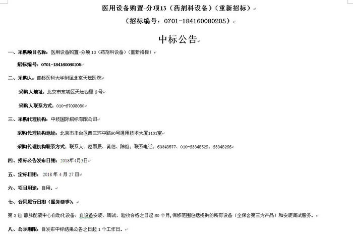 北京天坛医院医用设备购置-分项13(药剂科设备)(重新招标)中标公告