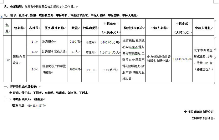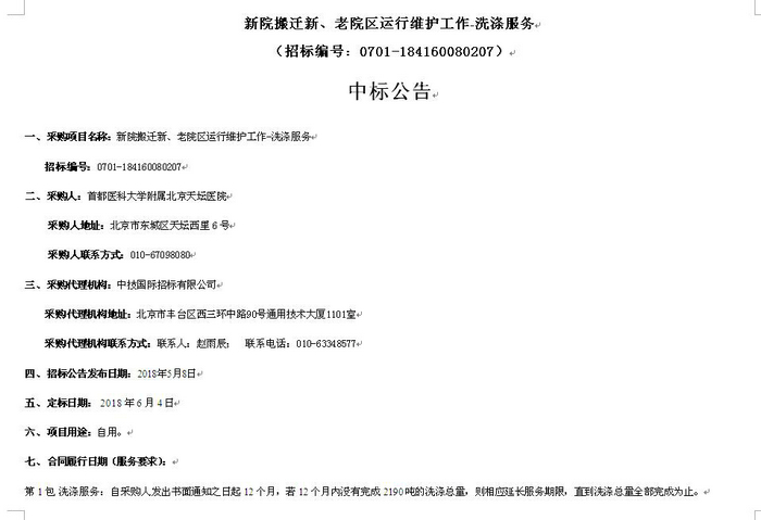 北京天坛医院新院搬迁新、老院区运行维护工作-洗涤服务中标公告