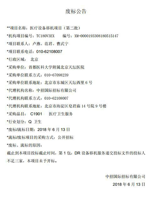 北京天坛医院医疗设备移机项目(第二批)废标公告