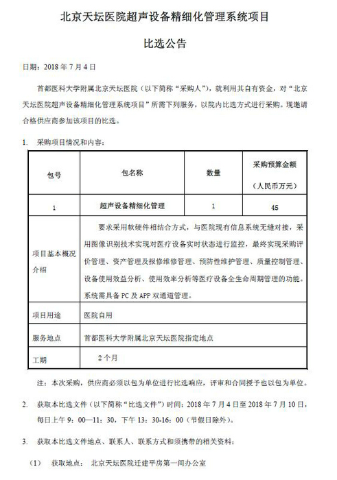 北京天坛医院超声设备精细化管理系统项目比选公告