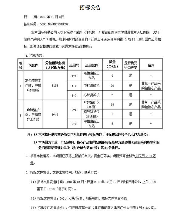 北京天坛医院迁建工程医用设备购置-分项13招标公告